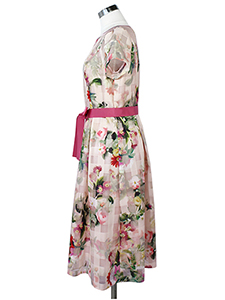 チェックxフラワーシアーワンピース ・程よい透け感がきれいなチェック柄にフラワープリントを施した、ウエストリボン付きワンピース☆