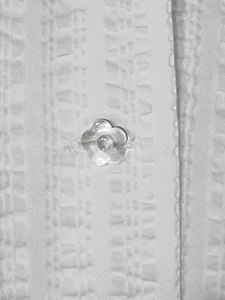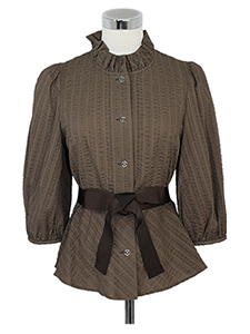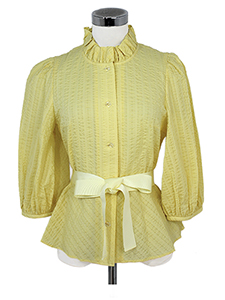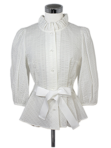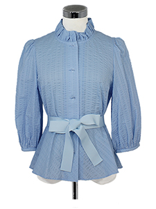 サッカーリボン付きブラウス ・フリル襟にリボンやフラワーボタンとキュートなアイテムが揃った、シアサッカーの涼しげなブラウス☆