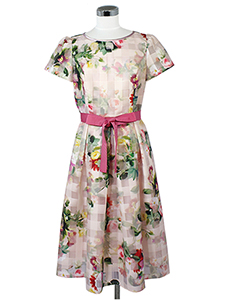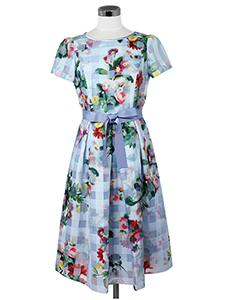 チェックxフラワーシアーワンピース ・程よい透け感がきれいなチェック柄にフラワープリントを施した、ウエストリボン付きワンピース☆