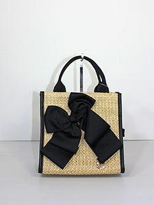 スクエア雑材リボントート ・マチもたっぷりある大きなリボンとトリミングがアクセントの雑材トートバッグ☆